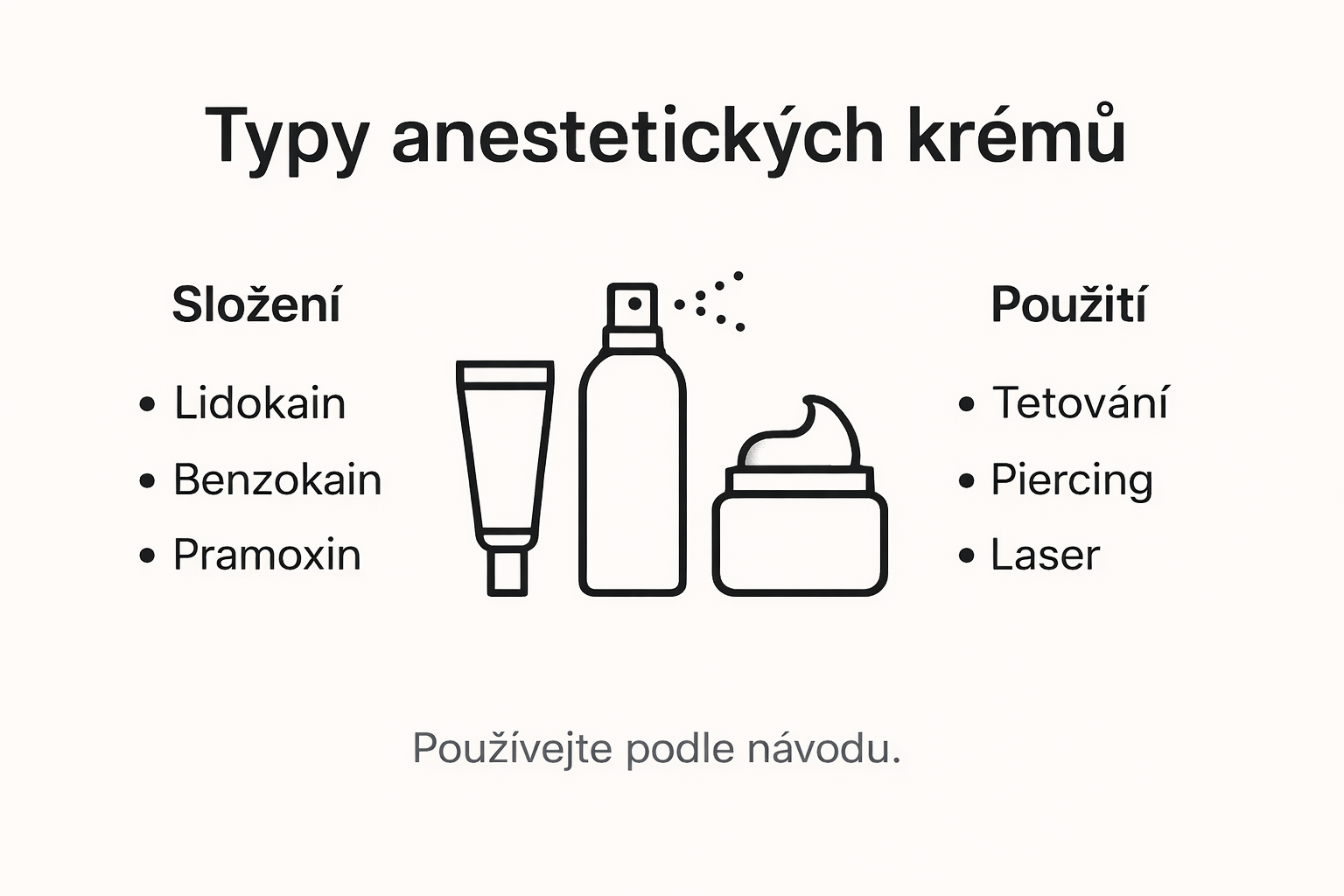 Existují různé typy znecitlivujících krémů a gelů, které se liší svým složením a intenzitou účinku. Nejčastěji obsahují látky jako lidokain nebo prilokain, které dočasně znecitlivují pokožku. Rizika používání znecitlivujících krémů je však nutné pečlivě zvážit. Odborníci doporučují konzultovat použití těchto přípravků přímo s tetovacím umělcem, který nejlépe posoudí vhodnost a bezpečnost konkrétního produktu.