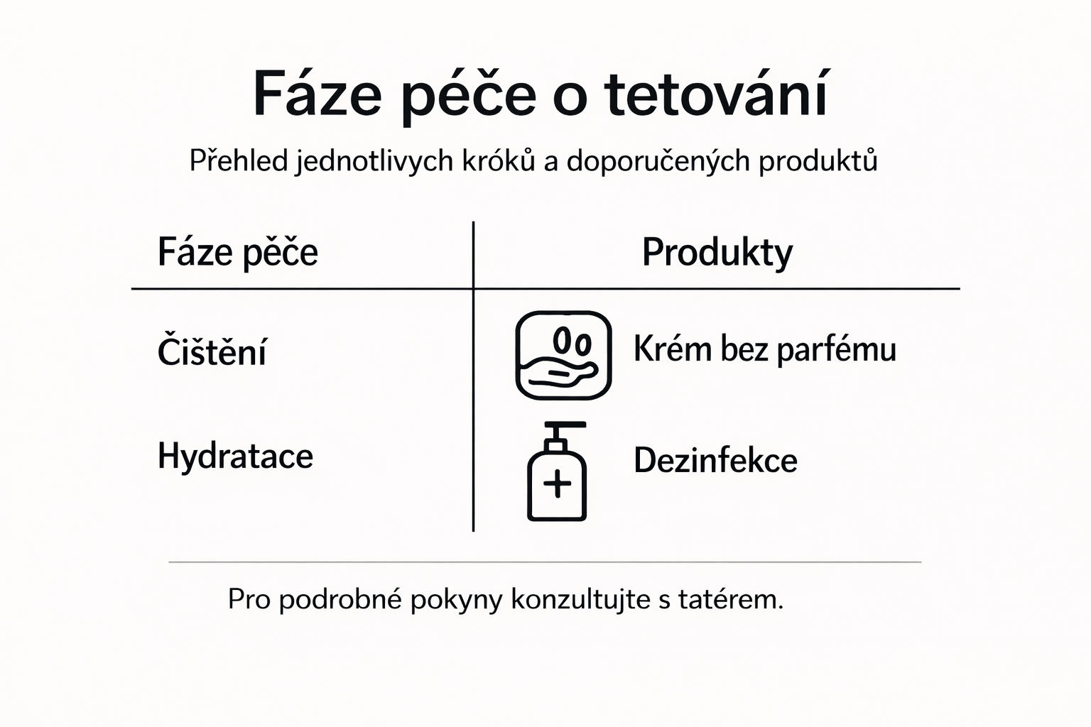 Klíčové fáze zahrnují důkladné čištění, hydrataci a ochranu tetované pokožky. Je důležité používat vhodné přípravky a dodržovat doporučení tetovacího umělce pro nejlepší výsledky.