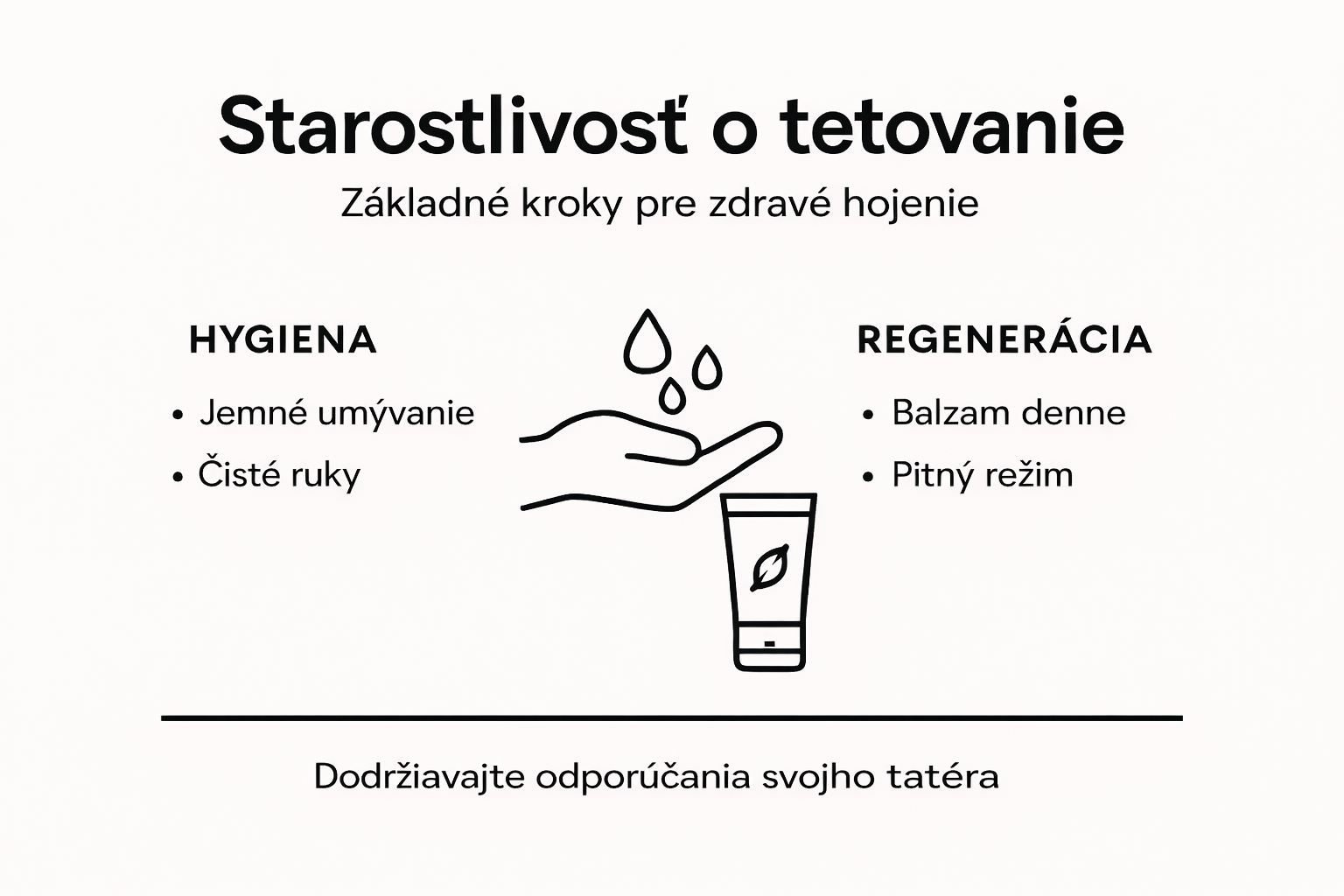 Pro péči o čerstvé tetování si vyberte přípravky určené speciálně pro tetovanou pokožku, které obsahují přírodní složky. Aplikujte tenkou vrstvu balzámu několikrát denně, aby byla pokožka hydratovaná a chráněná.